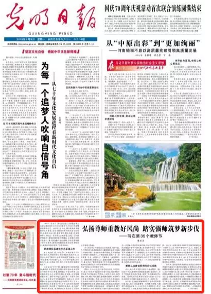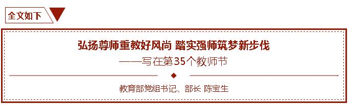 第35个教师节将至,35年来,教师队伍建设情况如何?取得了哪些成绩?如何进一步弘扬尊师重教好风尚?9月9日,教育部长陈宝生在《光明日报》撰文《弘扬尊师重教好风尚 踏实强师筑梦新步伐》,一起来看全文↓↓↓