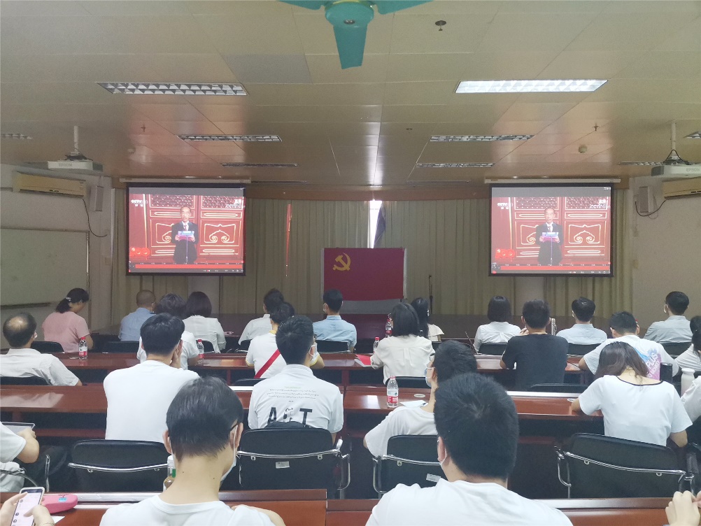 学院党委在南海楼338设立学院视频直播观看主会场,学院党委书记卢健民、副院长魏凯敏、党委委员/行政副院长朱丽君、机关支部全体党员以及学生党员代表参加直播主会场会议。参会人员统一着装,佩戴员党员徽章,正襟端坐,以最庄重的姿态共同庆祝党的百年华诞。