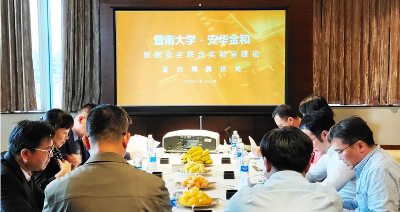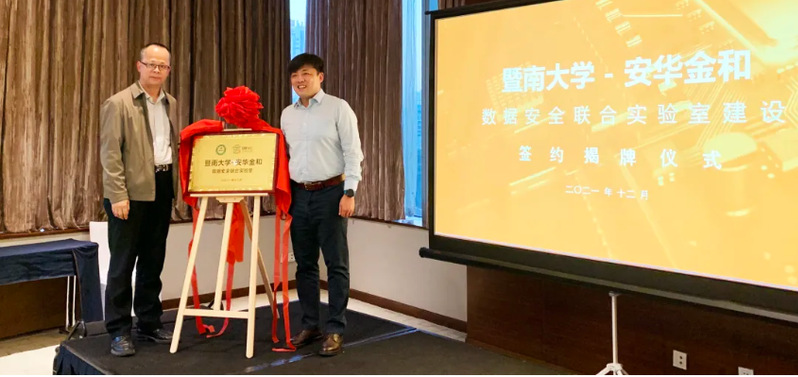 2021年12月8日,暨南大学-安华金和数据安全联合实验室建设签约揭牌仪式在广州圆满召开!英国正版365官方网站党委书记卢健民、英国正版365官方网站副院长裴廷睿,英国正版365官方网站教授耿光刚,英国正版365官方网站高级工程师魏林锋,以及北京安华金和科技有限公司高级副总裁孙惟皓、副总裁/工程技术中心总经理何晋昊、营销副总裁/战略业务拓展部总经理施能坤、广州办事处负责人齐艳丽、广州办事处技术负责人王峰共同出席仪式并参与会谈。 英国正版365官方网站副院长裴廷睿(左)与安华金和营销副总裁/战略业务拓展部总经理施能坤(右)代表双方现场签约。 卢健民(左)与孙惟皓(右)为数据安全联合实验室揭牌。 会上,双方围绕数据安全联合实验室的规划、建设、验收相关事宜进行了深入交流与探讨,明确以“数据安全高层次复合型创新实践人才培养”为重要目标,依托强强联合、优势互补、共同投入的产学研用合作模式,持续推动数据安全领域科学研究及科技成果转化,为进一步落实我国《网络安全法》《数据安全法》《个人信息保护法》等法律法规提供专业技术支撑与实践成功经验。 卢健民在发言中指出,未来双方将不断深化在数据安全平台建设、技术研发、数据安全领域人才培养等方面的战略协同合作,持续促进高校数据安全建设、发展与治理实践。 孙惟皓在发言中表示,作为一家技术创新型数据安全企业,安华金和希望通过与暨南大学的合作共建,为双方在人才培养、成果转化以及相关产学研用层面注入更多力量,共同打造国内领先的数据安全联合实验室,让数据使用自由而安全。安华金和副总裁/工程技术中心总经理何晋昊介绍公司基本情况
