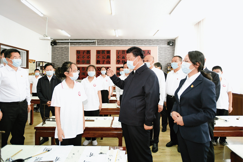 2021年9月13日至14日,中共中央总书记、国家主席、中央军委主席习近平在陕西省榆林市考察。这是14日上午,习近平在绥德实验中学考察时,同正在练习书法的学生亲切交流。 新华社记者 李学仁/摄