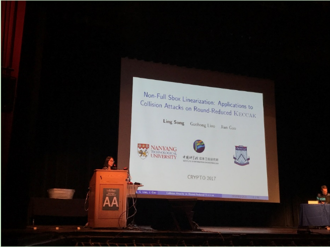 2016年2月,还在中国科学院信息工程研究所担任助理研究员的宋凌,就收到了来自新加坡南洋理工大学的访学邀请。由于宋凌工作出色且双方合作顺利,新加坡的访学期限由原定的7个月延长至39个月。期间,她主要对哈希函数标准SHA-3进行安全性分析,双方合作在SHA-3的三大类安全分析上分别给出国际领先的研究成果。