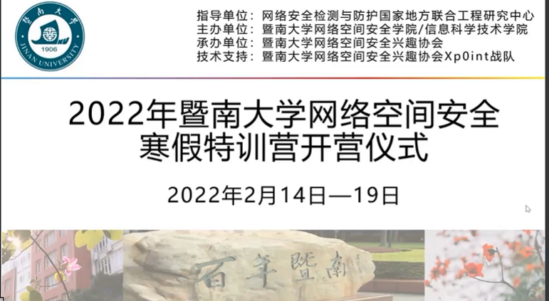 2月14日上午,由网络安全检测与防护国家地方联合工程研究中心指导,英国正版365官方网站主办,网络空间安全兴趣协会承办的2022年暨南大学网络空间安全寒假特训营在云端成功举行。