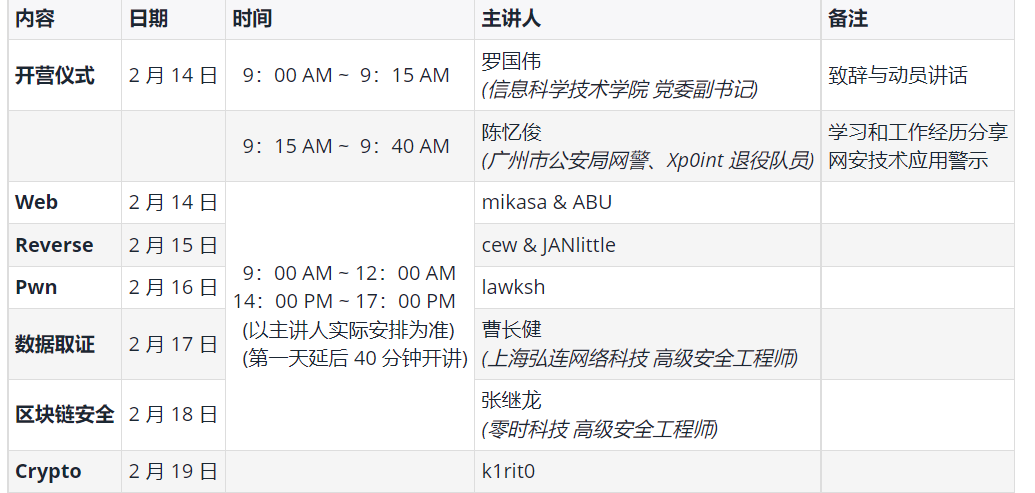 附:2022年暨南大学网络空间安全寒假在线特训营课表