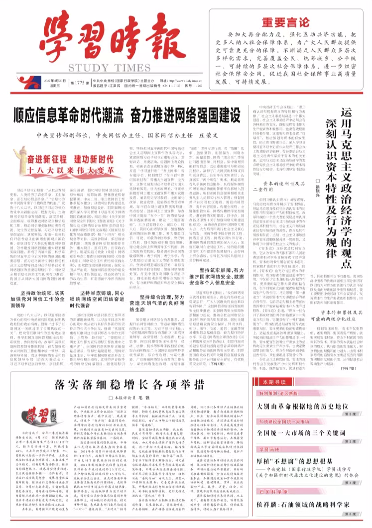 4月20日,《学习时报》在头版头条刊发中央宣传部副部长、中央网络安全和信息化委员会办公室主任、国家互联网信息办公室主任庄荣文署名文章。全文转发如下: