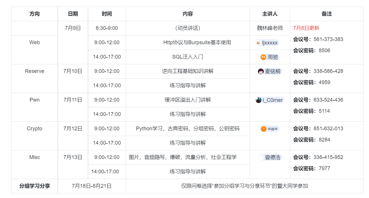 附:2022暨南大学网络空间安全竞赛暑期特训营日常安排