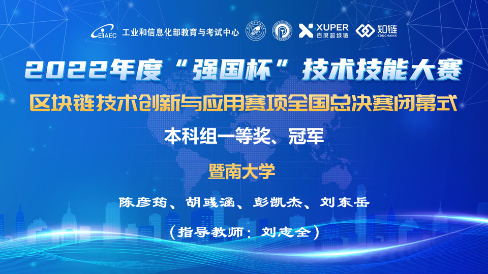 2022年度“强国杯”技术技能大赛——区块链技术创新与应用赛项全国总决赛由工业和信息化部教育与考试中心主办,旨在通过竞赛加强学生对新技术的理解与掌握,提高学生业务操作能力,培养学生的系统思维和创新思维。本次大赛分为本科组和高职组两个赛道,全国共计101所高校参加本次大赛。鉴于疫情影响,本次大赛采用线上方式举行。经过为期6天的区块链技术项目开发和3小时的区块链技术竞赛,学院网安学子最终在全国总决赛中以1600.9的总分荣获本科组一等奖、冠军,赛出了暨大风采,彰显了暨大学子求真务实的精神。