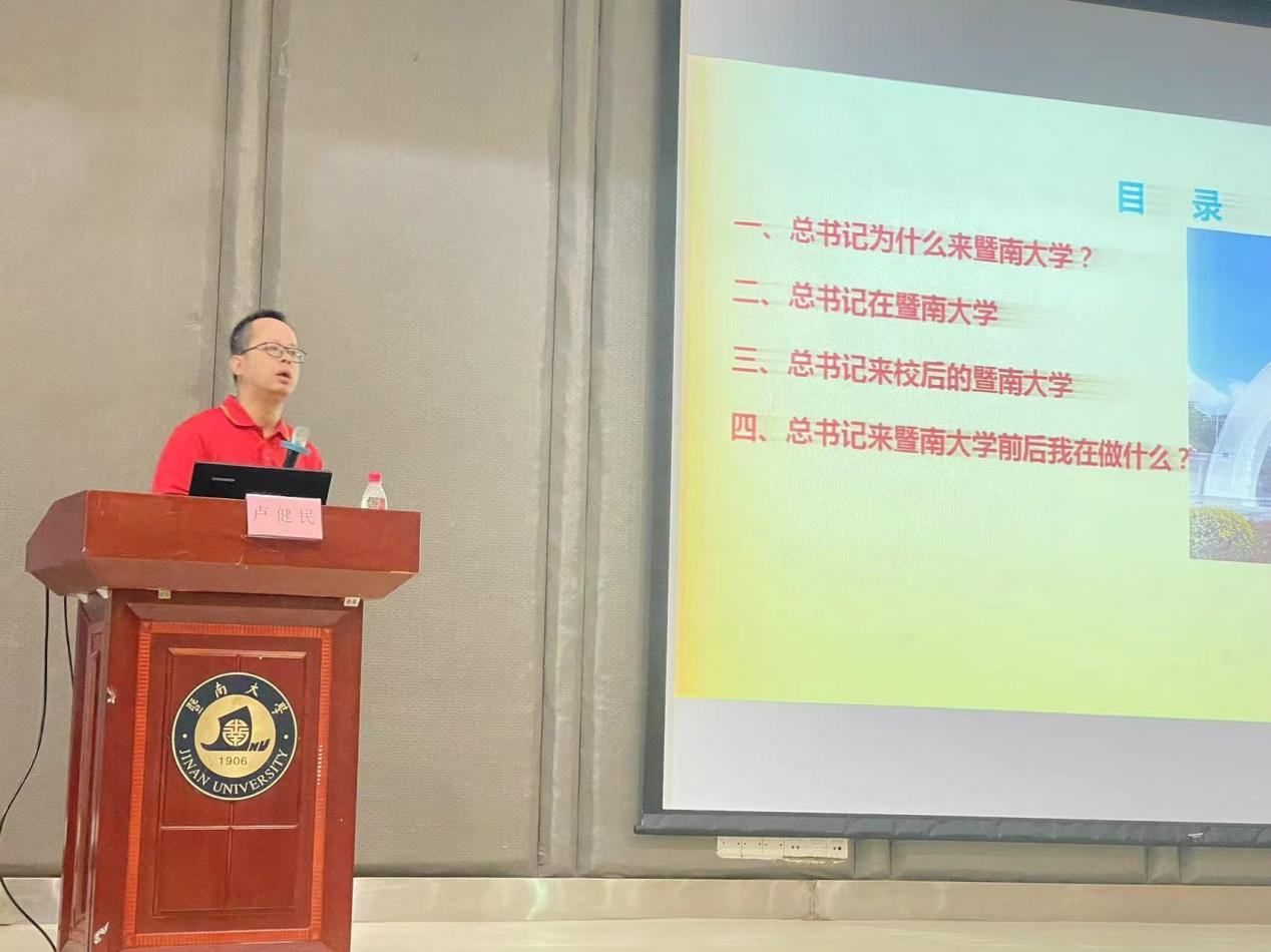 2023年是习近平总书记视察暨南大学5周年的重要年份。9月8日上午,英国正版365官方网站邀请学院原党委书记、学校驻五邑大学帮扶工作队卢健民队长在番禺校区恒大楼201,开展“习近平总书记来到暨南大学”主题讲座,为2023级本科新生开展“学精神、知校史、立大志”的思政第一课。会议由学院党委书记罗国伟主持。