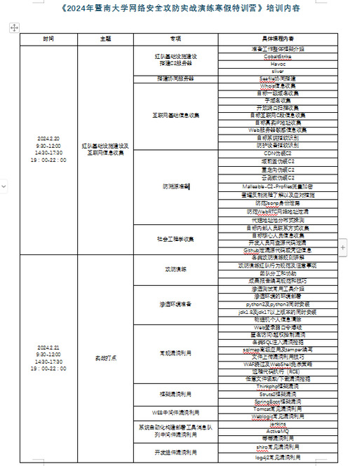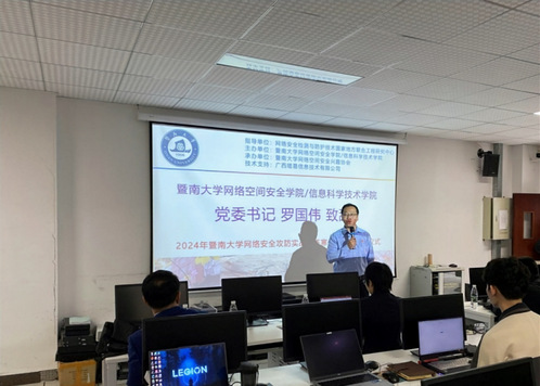 为更好地落实国家“一流网络安全学院”建设单位人才培养的要求,2024年2月20日至25日,2024年暨南大学网络安全攻防实战寒假特训营在番禺校区成功举办,这是自2018年以来,学校连续第七年举办网络安全特训营。本次特训营以实战能力提升为核心,为暨南大学网络空间安全学科支撑粤港澳大湾区以及国家网络安全重要任务选拔实战人才,进一步为暨南大学内部攻防、培训实战人才,进一步为“粤盾”、“粤网安”、全国教育系统网络安全攻防演习以及国家级网络安全攻防演练等重要活动提供实战人才支撑。