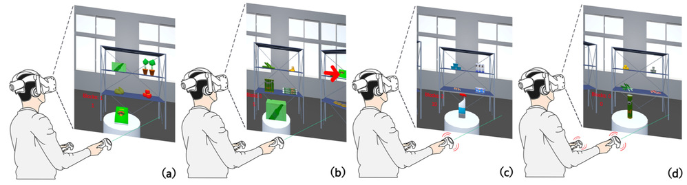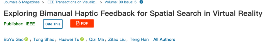IEEE TVCG期刊论文“Exploring Bimanual Haptic Feedback for Spatial Search in Virtual Reality” 主要聚焦虚拟现实的空间搜索,该主题是虚拟现实领域中非常重要且基础的交互技术之一,可应用到多种场景,如智慧教育、智慧医疗等。本论文提出了一种创新的映射机制,即引入双手震动反馈与空间方向位置形成映射,对比了4种双手触觉反馈技术对VR中空间定位与搜索的影响。实验结果表明,相比VR空间引导视觉反馈、单手听觉与触觉反馈技术,本论文提出的双手触觉反馈技术能实现更高效与准确的空间搜索性能,实验结果也为设计与使用双手触觉反馈进行空间搜索的相关应用提供设计指南等。