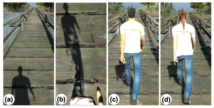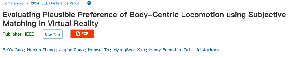 IEEE VR会议论文“Evaluating Plausible Preference of Body-Centric Locomotion using Subjective Matching in Virtual Reality”主要关于虚拟行走体验研究,该主题是虚拟现实应用中必备的交互技术之一,包括现实行走、重定向行走、肢体控制移动、瞬间移动等。本论文主要聚焦在肢体控制的移动交互技术,借助于用户手臂、头部或躯干的移动来实现虚拟场景中移动,先确定了可能影响可信行走体验的五个相关参数,即视角、虚拟化身外观、控制移动的身体部位、传递函数和传递函数系数,并首次采用主观匹配评估技术(Subjective Matching Technique)来探索VR中肢体控制的可信行走体验。实验结果为虚拟现实应用中多参数的虚拟移动可信体验与基于肢体控制移动的身份认证方案提供设计指南等。