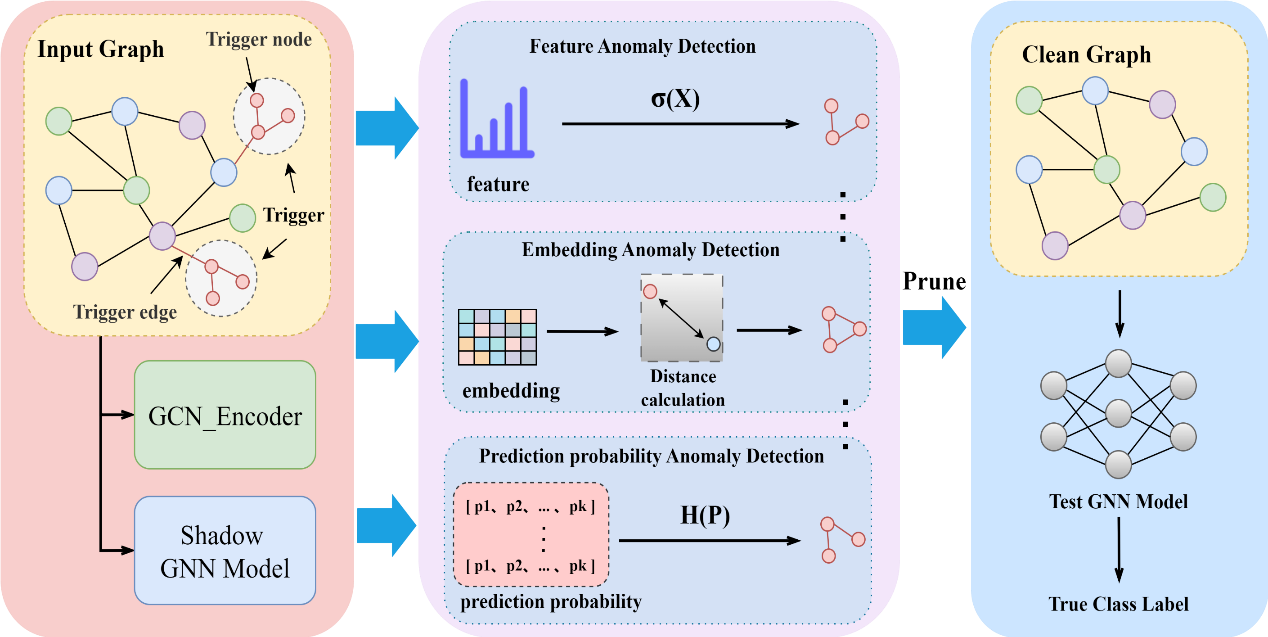 张继连教授课题组论文“Sanitizing Backdoored Graph Neural Networks:a Multidimensional Approach”研究了图神经网络后门攻击的防御问题。图神经网络(GNN)是以图数据作为处理对象的一种深度学习方法,被广泛运用于聚类、分类、预测等各种图学习任务。目前,图神经网络所面临的最大安全威胁是后门攻击(Backdoor attack)。该论文系统的研究了各种最新后门攻击方法所生成的触发器的特点,发现在结点属性值分布、结点嵌入距离、结点分类预测概率等多个维度上触发器结点与正常结点有明显的区别。课题组设计了一种多维防御方法MAD,用于抵御结点分类任务场景中的图神经网络后门攻击。大量实验表明,与最新的4种后门攻击算法及5种防御方法相比,MAD能非常有效的识别并清除各种植入的后门,将后门攻击成功率从91.8%降到0.6%。该论文的第一作者为英国正版365官方网站硕士研究生赵容。