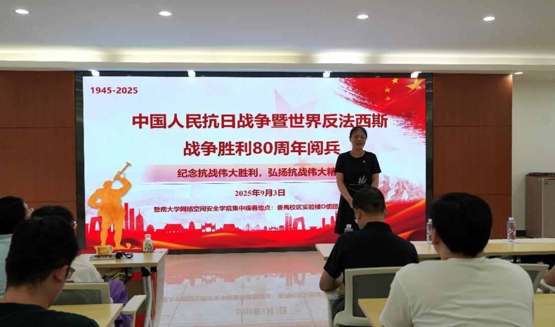 阅兵直播结束后,学院党委副书记朱丽君分享了观看心得。她说,此次阅兵既是对历史的缅怀,更是国家实力的展示,彰显我国捍卫和平、维护主权的坚定立场。提到网络空间部队受阅,朱丽君表示,这充分体现了国家对网络空间安全的高度重视,网络空间是国家战略核心领域,学院作为网安人才培养阵地,责任重大、使命光荣。她勉励师生将爱国热情转化为实干动力,深入学习贯彻习近平总书记的讲话精神,传承和弘扬伟大抗战精神,在科研教学中攻坚克难,在专业学习中精益求精,提升网络安全防护与创新能力,成长为国家网安事业的建设者与守护者,未来为学院争光、为祖国添彩。